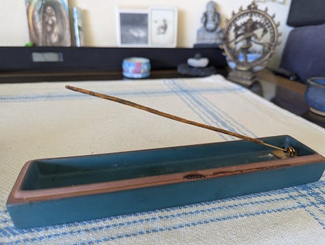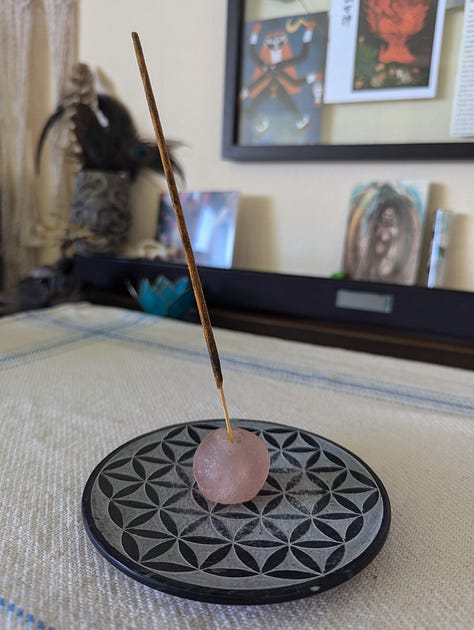 You will want to burn your incense in a room with good ventilation. I think one of the reasons why people complain of incense smoking them out or giving them a headache is due to burning it in a room that is too close, such as a bedroom or bathroom. I myself made this mistake in my 20s, and it kept me from trying incense again for decades. It wasn’t until I moved to Hawai’i, where I can keep windows open year-round, that incense really clicked for me. I burn mine at my living room altar or in my workshop, which are both large rooms with several open windows. When I burn incense while I take a bath, I make sure to open a window and a door.