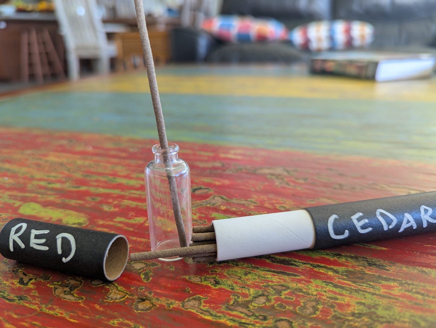 As a work friend’s birthday was coming up, I planned to give her some of the pom-as-stick, too, but I had run out of extra incense holders. I unexpectedly discovered a new, cheap, and interesting source of incense holders at Glass from the Past, the local junk store that has been a treasure trove of finds. Because Big Island didn’t start recycling glass until the 80s, glass was simply buried along with other household trash. Glass from the Past’s owner digs through these middens (some of which are 80-90 years old), cleans up his finds, and offers them for sale at his shop. Thus you can find opaque white cold cream jars, gorgeous deep blue medicine vials, and vintage Coke bottles in his shop, all from a time before plastic was the default container for all things. This past weekend, the owner’s wife showed me a cache of the teeniest, tiniest little medicine bottles from the 30s and 40s, all for a few bucks each. My joss sticks are too fat for most typical incense holders, so these little bottles were perfect.